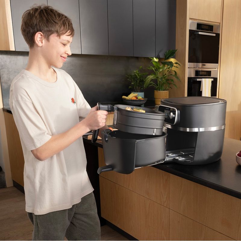 Gdy chcemy przygotować dwa dania jednocześnie, z pomocą przychodzi Philips Ovi Dual Basket – najnowszy airfryer z dwoma niezależnymi koszami o pojemności 3 i 6 litrów, który pozwala gotować różne potrawy w tym samym czasie i temperaturze lub z różnymi ustawieniami (np. kurczaka w jednym koszu i warzywa w drugim). Dzięki funkcji Smart SyncFinish wszystko kończy się gotować równocześnie, niezależnie od czasu potrzebnego na przygotowanie poszczególnych dań. Technologia RapidAir Plus zapewnia równomierne opiekanie, a funkcja gotowania na parze pozwala przyrządzać delikatne, soczyste potrawy, zachowując ich wartości odżywcze.