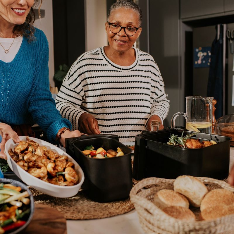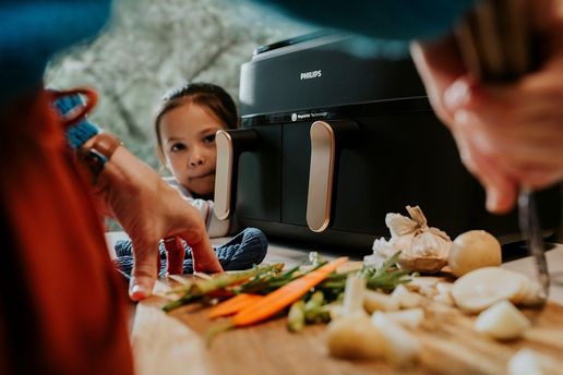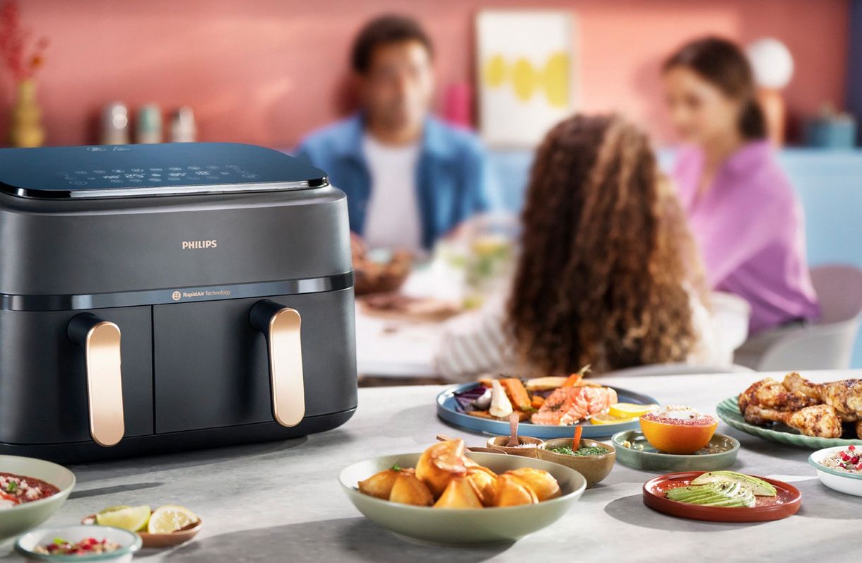 Gdy chcemy przygotować dwa dania jednocześnie, z pomocą przychodzi Philips Ovi Dual Basket – najnowszy airfryer z dwoma niezależnymi koszami o pojemności 3 i 6 litrów, który pozwala gotować różne potrawy w tym samym czasie i temperaturze lub z różnymi ustawieniami (np. kurczaka w jednym koszu i warzywa w drugim). Dzięki funkcji Smart SyncFinish wszystko kończy się gotować równocześnie, niezależnie od czasu potrzebnego na przygotowanie poszczególnych dań. Technologia RapidAir Plus zapewnia równomierne opiekanie, a funkcja gotowania na parze pozwala przyrządzać delikatne, soczyste potrawy, zachowując ich wartości odżywcze.
